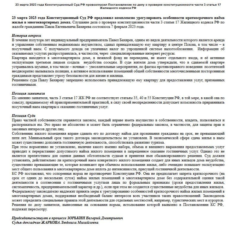 Исчерпав все возможности и получив отказ даже в Верховном суде, а это, кстати, сложившаяся практика, Иванов решил обратиться в Конституционный суд Российской Федерации, благо что от Пскова до Питера не так далеко. Владелец квартиры начал с того, что оспорил часть 3 статьи 17 Жилищного Кодекса РФ. По его мнению контекст статьи противоречит Конституции в части ограничения свободы частной собственности (где-то мы уже это слышали в 2019 году) Законодатель чётко определил понятие гостиничного номера: это предприятие, помещение, удобства, сервис, всё это единый комплекс указанный в документе. Тем не менее суды ранее установили, что его квартира не является «частью гостиницы» и не имеет таковых признаков, признаков гостиницы, а значит не обладает одним из самых важных признаков. Проще говоря, гостиничные услуги возможно оказывать в гостинице или в месте с признаками отеля, при этом номер такового не может существовать отдельно, т. к. является комплексом. Соответственно посуточная аренда квартиры и сдача в аренду жилья это не одно и то же.